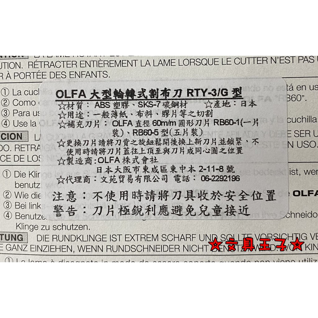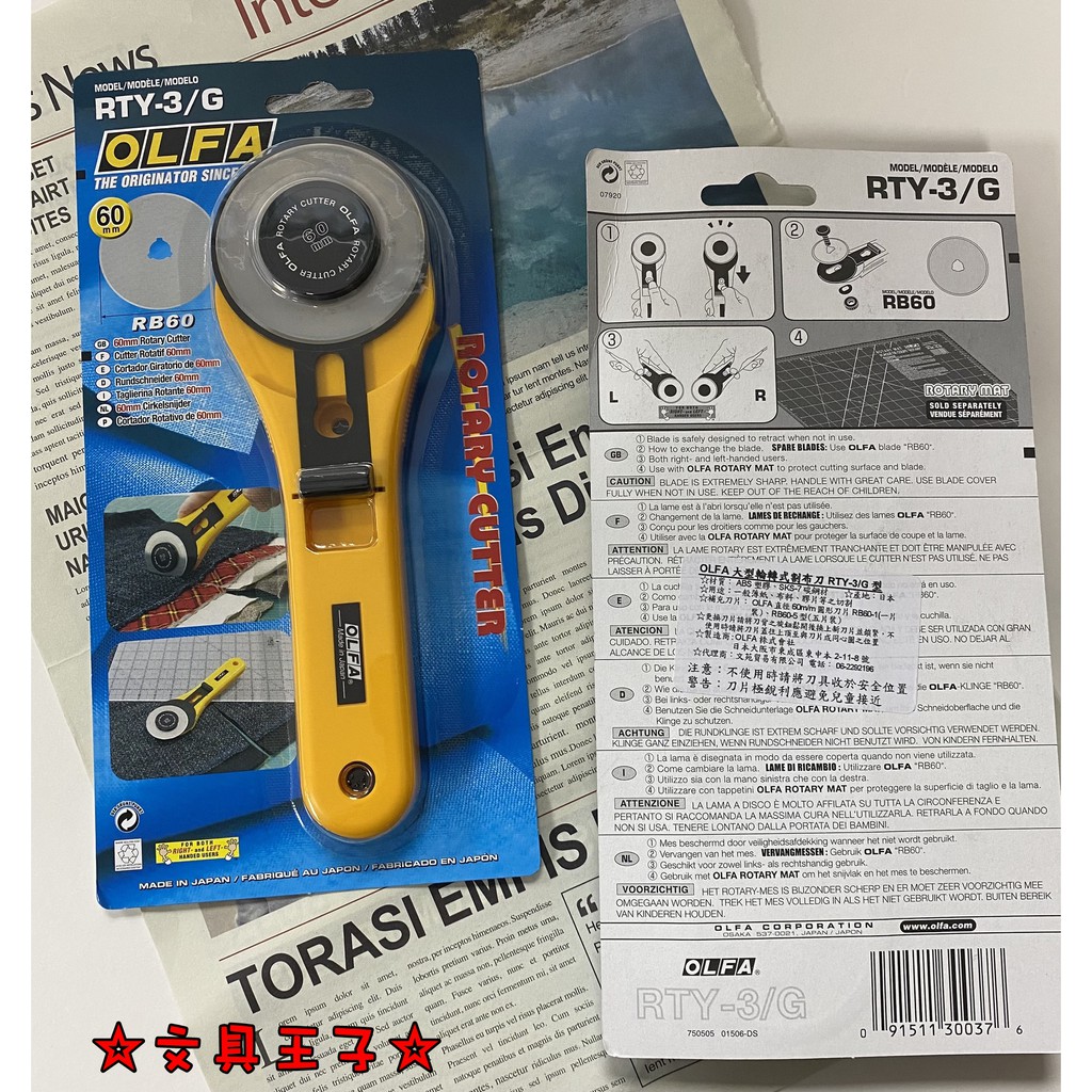 OLFA 大型輪轉式割(拼)布刀. RTY-3/G型/60m/m割(拼)布刀刀片RB60-1型